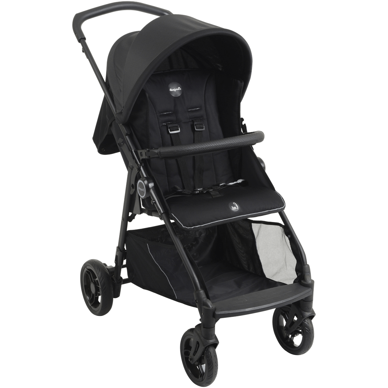 O modelo possui encosto reclinável em quatro posições, capota regulável e removível, cinto de segurança de cinco pontos, protetor frontal removível, rodas dianteiras giratórias, freio traseiro conjugado e cesto porta-objetos.